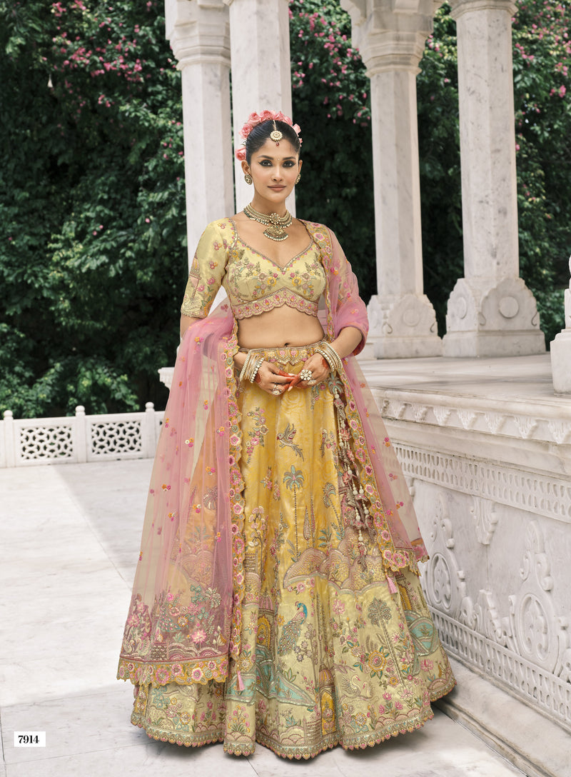 Haldi Fashion Wear Yellow Tissue Resham Floral Embroider Lehenga Choli