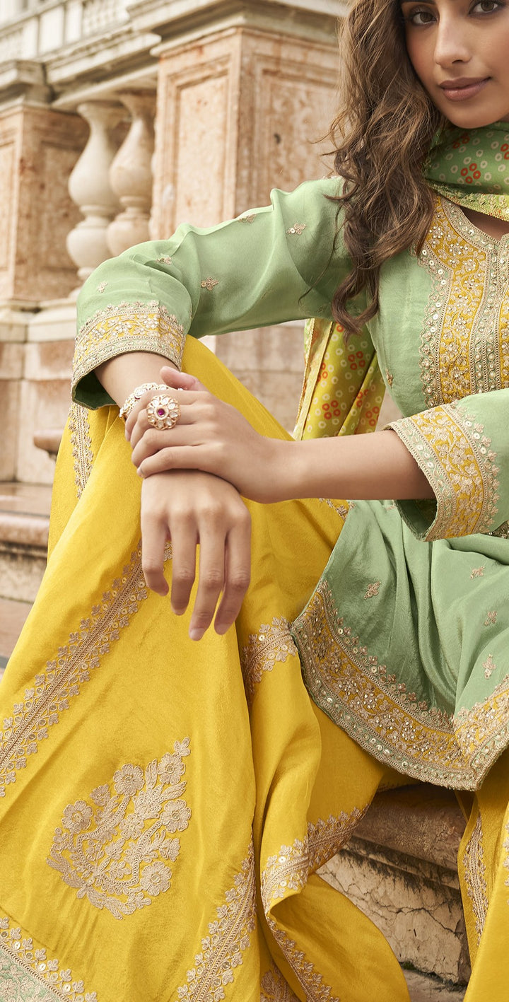 Destination wedding wear palazzo kameez dupatta traditional dress. Green yellow jacquard viscose silk stitched fashionable suit. Designer festive mehendi attire. Moti, sequins, stones, resham zari thread embroidered short kurta available in sizes...