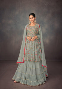 Exclusive Party Wear Latest Designer Stitched Kurti Set. Grey/Blue Georgette Stones, Foil Mirror, Lampi Lace, Sequins, Resham Zari Thread Embroidered Short Kurti upto 42" Bust, Grey/Blue Georgette Stitched Ghagra Style Sequined...